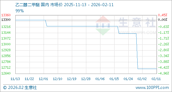 2月11日,生意社乙二醇二甲醚基准价为12700.00元/吨,与本月初持平。