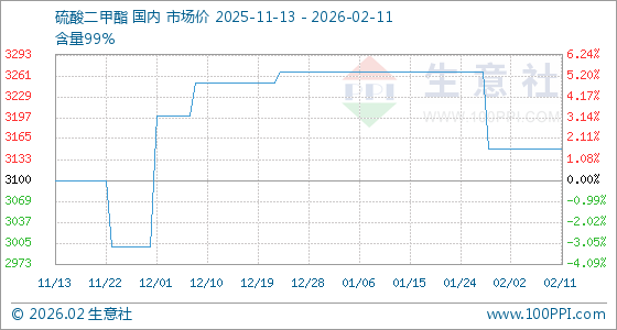 2月11日,生意社硫酸二甲酯基准价为3150.00元/吨,与本月初持平。