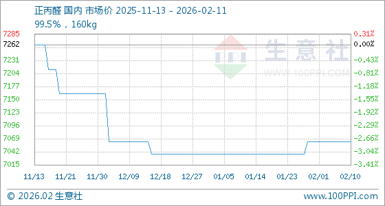 2月11日,生意社正丙醛基准价为7062.50元/吨,与本月初持平。