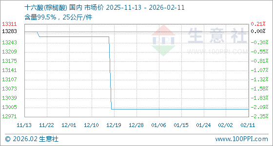 2月11日,生意社十六酸(棕榈酸)基准价为13000.00元/吨,与本月初持平。