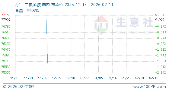 2月11日,生意社2,4-二氯苯胺基准价为75500.00元/吨,与本月初持平。