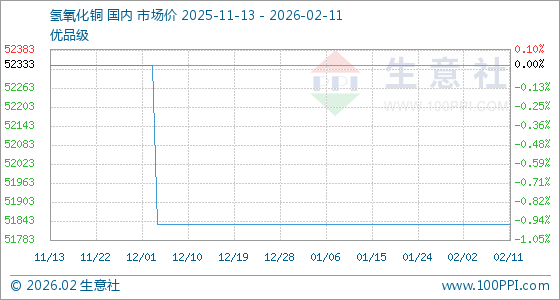 2月11日,生意社氢氧化铜基准价为51833.33元/吨,与本月初持平。