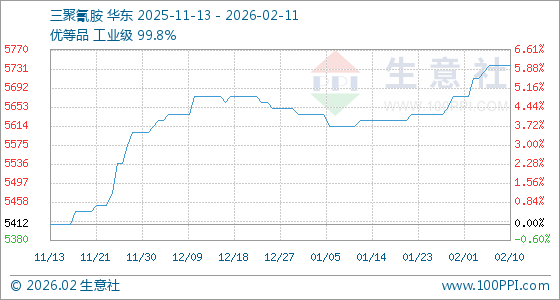 2月11日,生意社三聚氰胺基准价为5737.50元/吨,与本月初(5675.00元/吨)相比,上涨了1.10%。