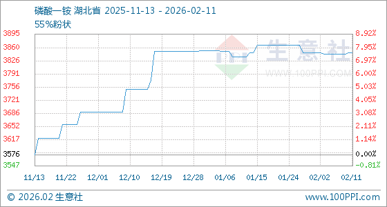 2月11日,生意社磷酸一铵基准价为3846.67元/吨,与本月初持平。