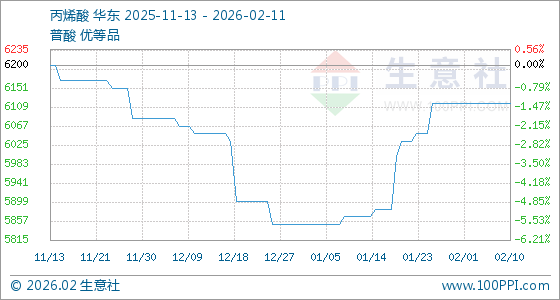 2月11日,生意社丙烯酸基准价为6116.67元/吨,与本月初持平。