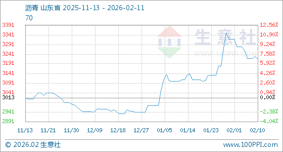 2月11日,生意社沥青基准价为3216.67元/吨,与本月初(3320.00元/吨)相比,下降了3.11%。