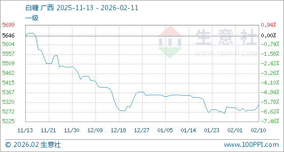 2月11日,生意社白糖基准价为5310.00元/吨,与本月初(5295.00元/吨)相比,上涨了0.28%。