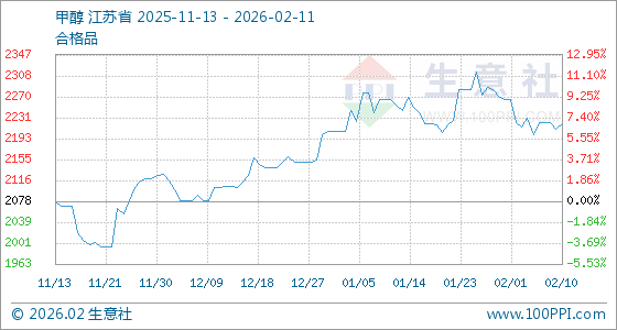 2月11日,生意社甲醇基准价为2220.00元/吨,与本月初(2265.00元/吨)相比,下降了1.99%。