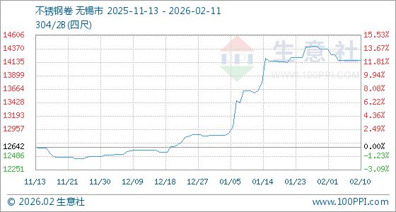 2月11日,生意社不锈钢卷基准价为14162.50元/吨,与本月初(14360.00元/吨)相比,下降了1.38%。