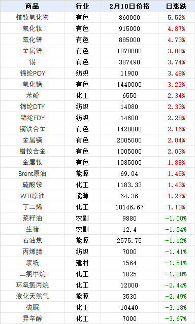 据生意社价格监测,2026年2月10日大宗商品价格涨跌榜中环比上升的商品共47种,集中在化工板块(共14种)和有色板块(共14种),涨幅在5%以上的商品主要集中在有色板块;涨幅前3的商品分别为镨钕氧化物(5.52%)、氧化钕(4.87%)、氧化镨(4.73%)。 环比下降的商品共32种,集中在化工(共10种)和农副(共6种),跌幅前3的商品分别为异辛醇(-3.67%)、硫脲(-3.18%)、液化天然气(-2.49%)。