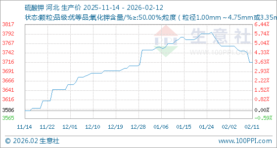 2月12日,生意社硫酸钾基准价为3716.67元/吨,与本月初(3760.00元/吨)相比,下降了1.15%。