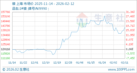 2月12日,生意社镍基准价为142583.33元/吨,与本月初(146016.67元/吨)相比,下降了2.35%。