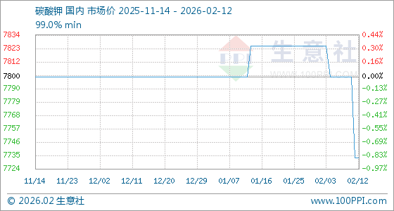 2月12日,生意社碳酸钾基准价为7733.33元/吨,与本月初(7825.00元/吨)相比,下降了1.17%。