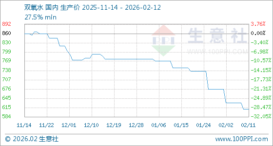 2月12日,生意社双氧水基准价为610.00元/吨,与本月初(676.67元/吨)相比,下降了9.85%。