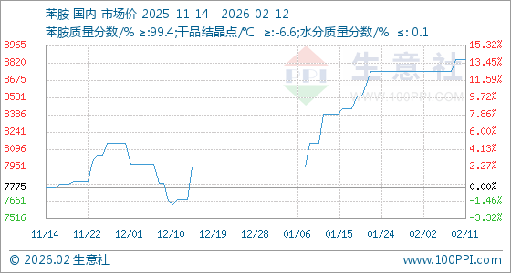 2月12日,生意社苯胺基准价为8845.00元/吨,与本月初(8745.00元/吨)相比,上涨了1.14%。