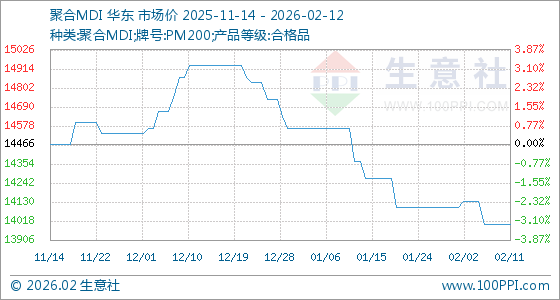 2月12日,生意社聚合MDI基准价为14000.00元/吨,与本月初(14100.00元/吨)相比,下降了0.71%。