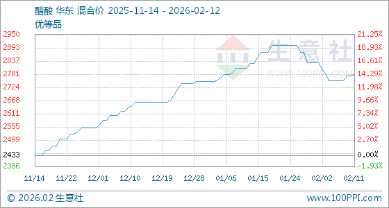 2月12日,生意社醋酸基准价为2780.00元/吨,与本月初(2830.00元/吨)相比,下降了1.77%。