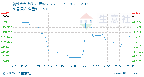 2月12日,生意社镝铁合金基准价为1435000.00元/吨,与本月初(1385000.00元/吨)相比,上涨了3.61%。