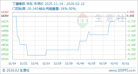 2月12日,生意社丁腈橡胶基准价为16250.00元/吨,与本月初(16175.00元/吨)相比,上涨了0.46%。
