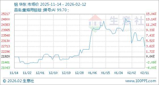 2月12日,生意社铝基准价为22676.67元/吨,与本月初(24666.67元/吨)相比,下降了8.07%。
