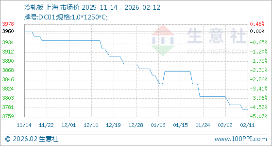 2月12日,生意社冷轧板基准价为3777.50元/吨,与本月初(3807.50元/吨)相比,下降了0.79%。