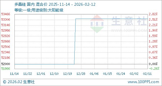 2月12日,生意社多晶硅基准价为53333.33元/吨,与本月初持平。