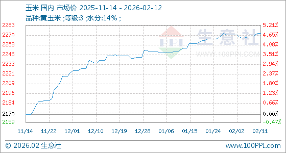 2月12日,生意社玉米基准价为2272.86元/吨,与本月初(2271.43元/吨)相比,上涨了0.06%。