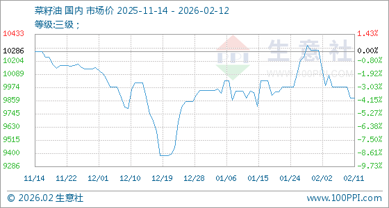2月12日,生意社菜籽油基准价为9880.00元/吨,与本月初(10298.00元/吨)相比,下降了4.06%。