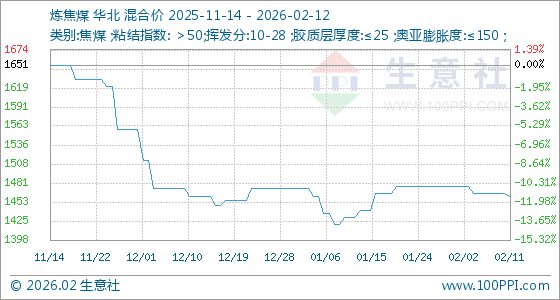 2月12日,生意社炼焦煤基准价为1461.25元/吨,与本月初(1476.25元/吨)相比,下降了1.02%。