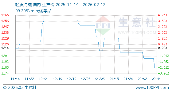 2月12日,生意社轻质纯碱基准价为1182.00元/吨,与本月初(1208.00元/吨)相比,下降了2.15%。