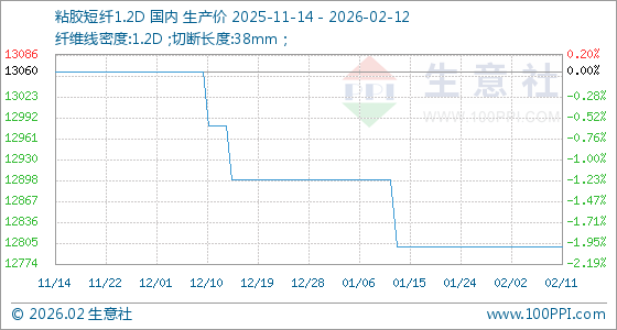2月12日,生意社粘胶短纤1.2D基准价为12800.00元/吨,与本月初持平。