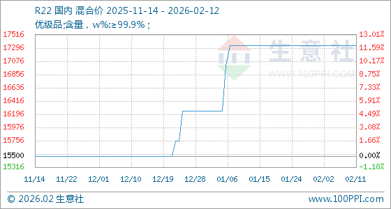 2月12日,生意社R22基准价为17333.33元/吨,与本月初持平。