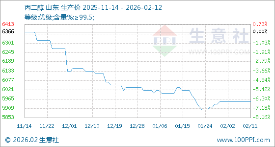 2月12日,生意社丙二醇基准价为5950.00元/吨,与本月初持平。