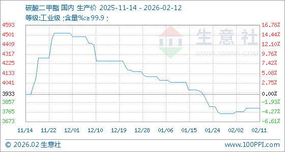 2月12日,生意社碳酸二甲酯基准价为3800.00元/吨,与本月初(3750.00元/吨)相比,上涨了1.33%。