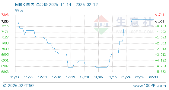 2月12日,生意社MIBK基准价为7266.67元/吨,与本月初持平。