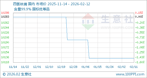 2月12日,生意社四氢呋喃基准价为10133.33元/吨,与本月初持平。