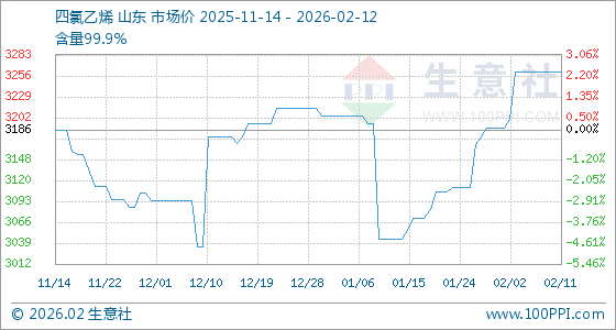 2月12日,生意社四氯乙烯基准价为3261.11元/吨,与本月初(3188.89元/吨)相比,上涨了2.26%。