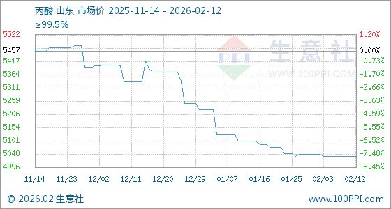 2月12日,生意社丙酸基准价为5040.00元/吨,与本月初(5046.25元/吨)相比,下降了0.12%。