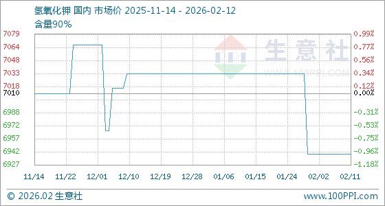 2月12日,生意社氢氧化钾基准价为6940.00元/吨,与本月初持平。