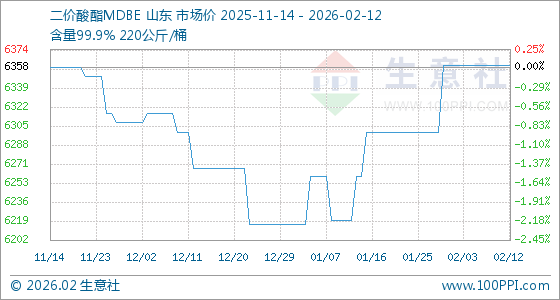 2月12日,生意社二价酸酯MDBE基准价为6360.00元/吨,与本月初持平。
