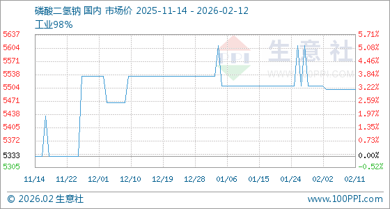 2月12日,生意社磷酸二氢钠基准价为5500.00元/吨,与本月初(5510.00元/吨)相比,下降了0.18%。