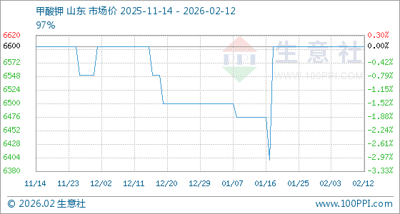 2月12日,生意社甲酸钾基准价为6600.00元/吨,与本月初持平。