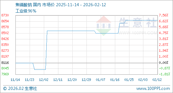 2月12日,生意社焦磷酸钠基准价为8666.67元/吨,与本月初持平。