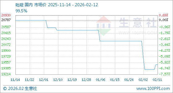 2月12日,生意社吡啶基准价为19500.00元/吨,与本月初(20187.50元/吨)相比,下降了3.41%。