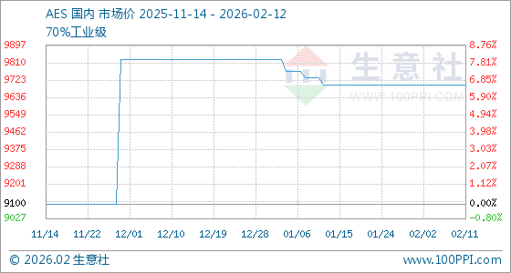 2月12日,生意社AES基准价为9700.00元/吨,与本月初持平。