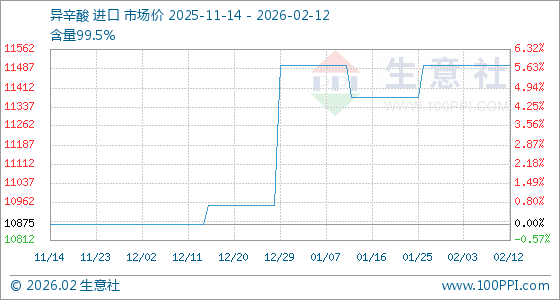 2月12日,生意社异辛酸基准价为11500.00元/吨,与本月初持平。