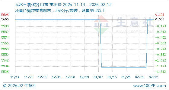 2月12日,生意社无水三氯化铝基准价为5600.00元/吨,与本月初(5533.33元/吨)相比,上涨了1.20%。