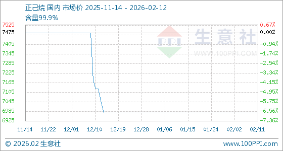 2月12日,生意社正己烷基准价为6975.00元/吨,与本月初持平。