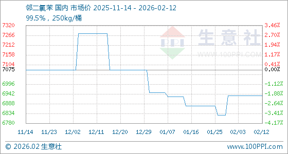 2月12日,生意社邻二氯苯基准价为6933.33元/吨,与本月初持平。