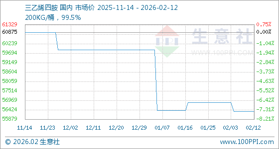 2月12日,生意社三乙烯四胺基准价为56333.33元/吨,与本月初(56833.33元/吨)相比,下降了0.88%。